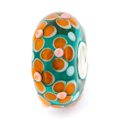 This glass bead is covered with four petaled flowers shaded delicately with hues that range from Persimmon to Dark Ochre. The flowers have a delicate raised center Salmon Pink. A dot detail in Crisp White goes around the outer edge of the bead for added interest. The flowers float on a Caribbean Green base that appears to be lit within as it captures the light.