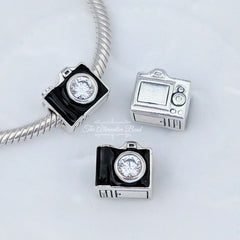 Camera Silver Charm with Black Enamel and Cubic Zirconia
