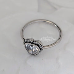 A stunning hand-finished ring in sterling silver by PANDORA, decorated with a dazzling heart-shaped cubic zirconia stone encircled with micro bead-set stones.