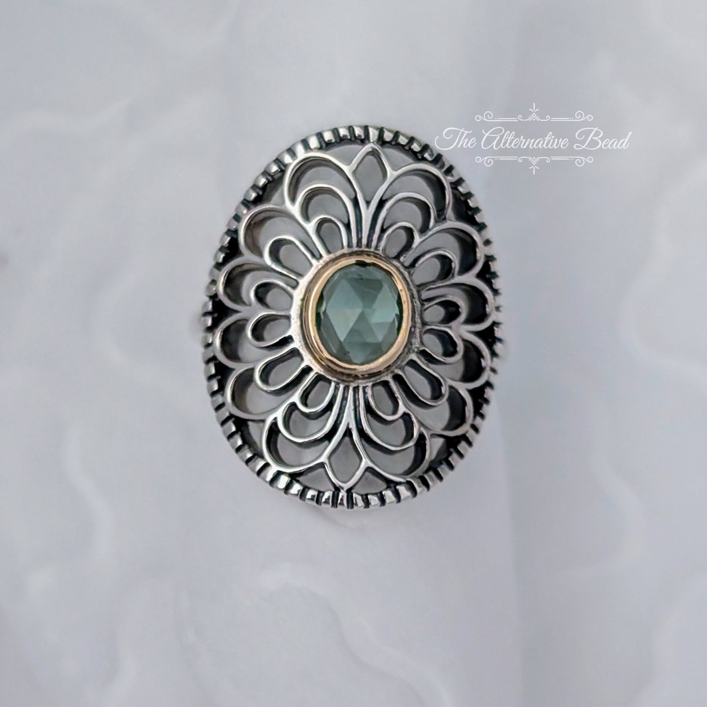 Silver ring with 14k and green synthetic spinel
