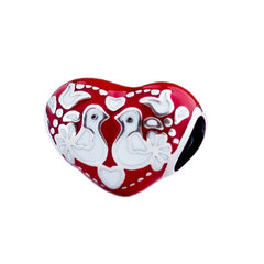 Lovebirds On Fire Charm Sterling Silver Aurora Charm from our exclusive Folk Art Inspired Enamel Collection. Original Folklore motif of two lovebirds kissing each other, with floral ornaments and hearts around them. Couple of birds in this position is a traditional love motif, what is folk art typically for German, Russian Hungarian, Slovak, Czech and Polish tradition. White enamel birds on the red background can resemble lovers in the flames of eternal love. Lovebirds On Fire Charm can be worn by itself on a neck chain as a pendant, or on a charm bracelet or charm necklace. Enjoy this beautiful folk art inspired jewellery piece from Aurora. In the same vein you can get one for one of your friend or family. We are sure they will love it. Because if its colour we think the best choice with this charm is our red triple leather bracelet. Of course You can wear it as a necklace too.