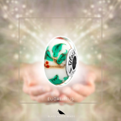 Hints of mint, silver-grey, and crystal shimmer blend in this luminous glass bead. Like a breath of eucalyptus mist, it clears emotional fog and awakens a new perspective.