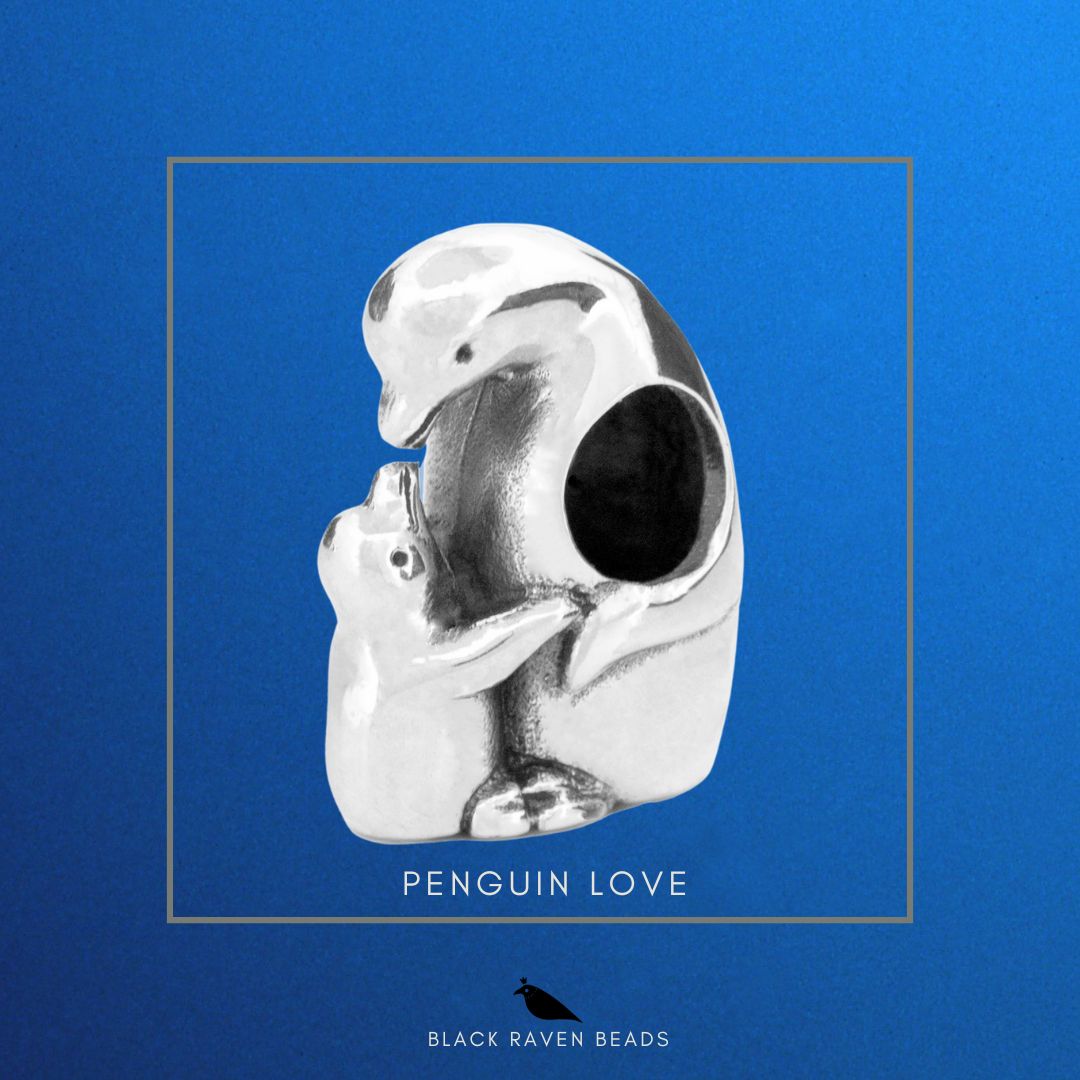 A baby penguin stands face to face with its parent, their beaks almost touching in a