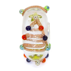 This gorgeous bead has three stylish golden Christmas trees decorated with ornaments and a diamond-shaped star engraved into the body of the bead. The sparkly white base helps to create a festive Christmas mood. All our glass beads are made with the highest quality glass, sourced from all over the world. All our beads have a silver core with a 5 mm hole that fits all European bead brands. Our cores are marked with E925. This logo stands for Elfbeads and sterling silver 925. If you want to be sure if your bead is an original Elfbeads, you can check the logo in the core.
