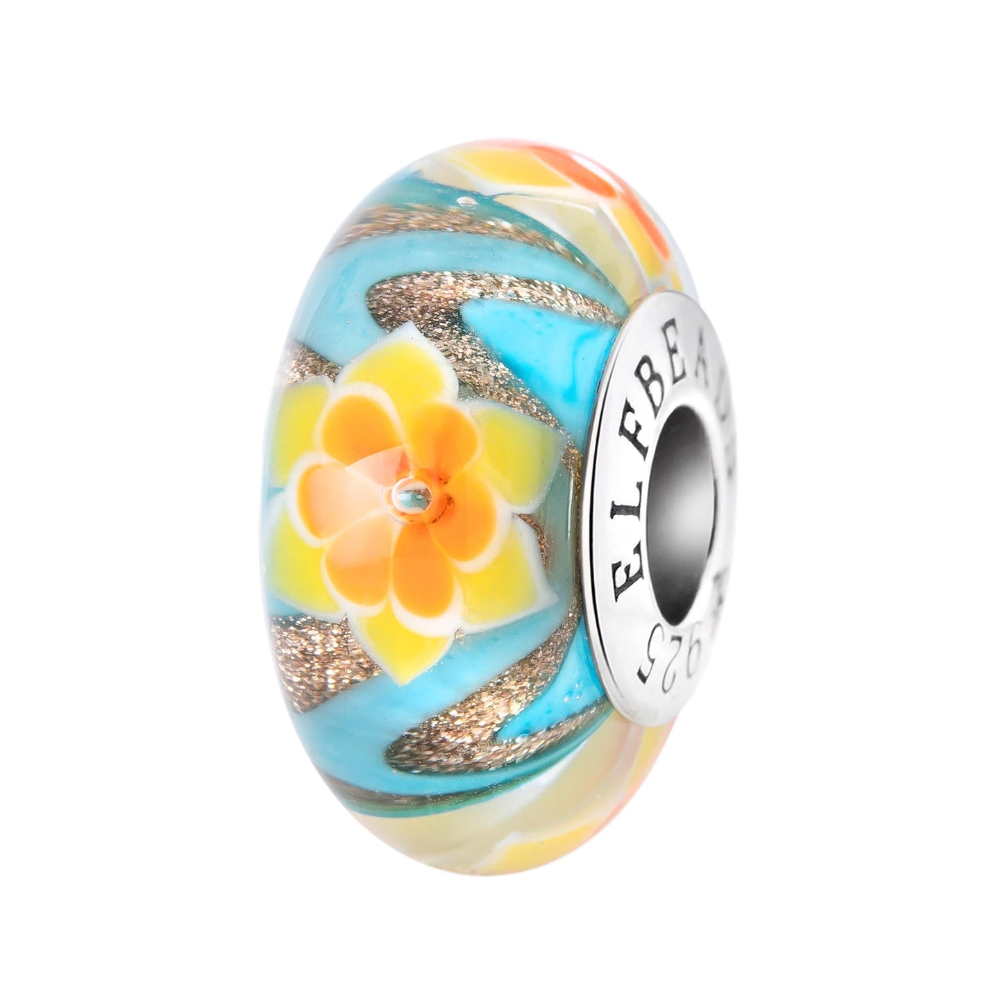 Heavenly Lotus Dream bead symbolizes a journey towards boundless aspirations. In its yellow-orange hues, the lotus represents enlightenment and the pursuit of higher wisdom, while the blue base evokes the vast, dreamy sky. The golden ribbons flow gently, symbolizing the path toward dreams and reminding us that every incredible journey begins with a single step toward something more significant.Our glass beads are crafted from the highest quality glass, sourced from all over the world. Each bead has a silver core with a 4.7mm hole, compatible with Elfbeads, Pandora, and Trollbeads bracelets. The core is marked with the E925 hallmark, representing Elfbeads and sterling silver 925.