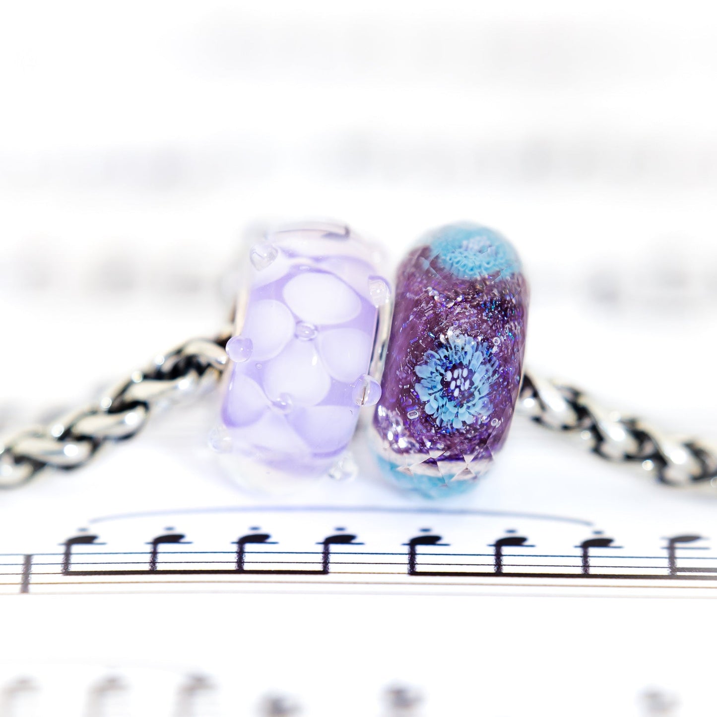This is our signature design of an interrupted petals pattern. Each flower has three petals which look like four because one flower gently floats into another. White petals of Lilac Perpetuals are floating on the base of subtle lavender color covered with a transparent layer of glass. The bead has raised dots on the sides. All our glass beads are made with the highest quality glass, sourced from all over the world. All our beads have a silver core with a 5 mm hole that fits all European bead brands. Our cores are marked with E925. This logo stands for Elfbeads and sterling silver925. If you want to be sure if your bead is an original Elfbeads, you can check the logo in the core.