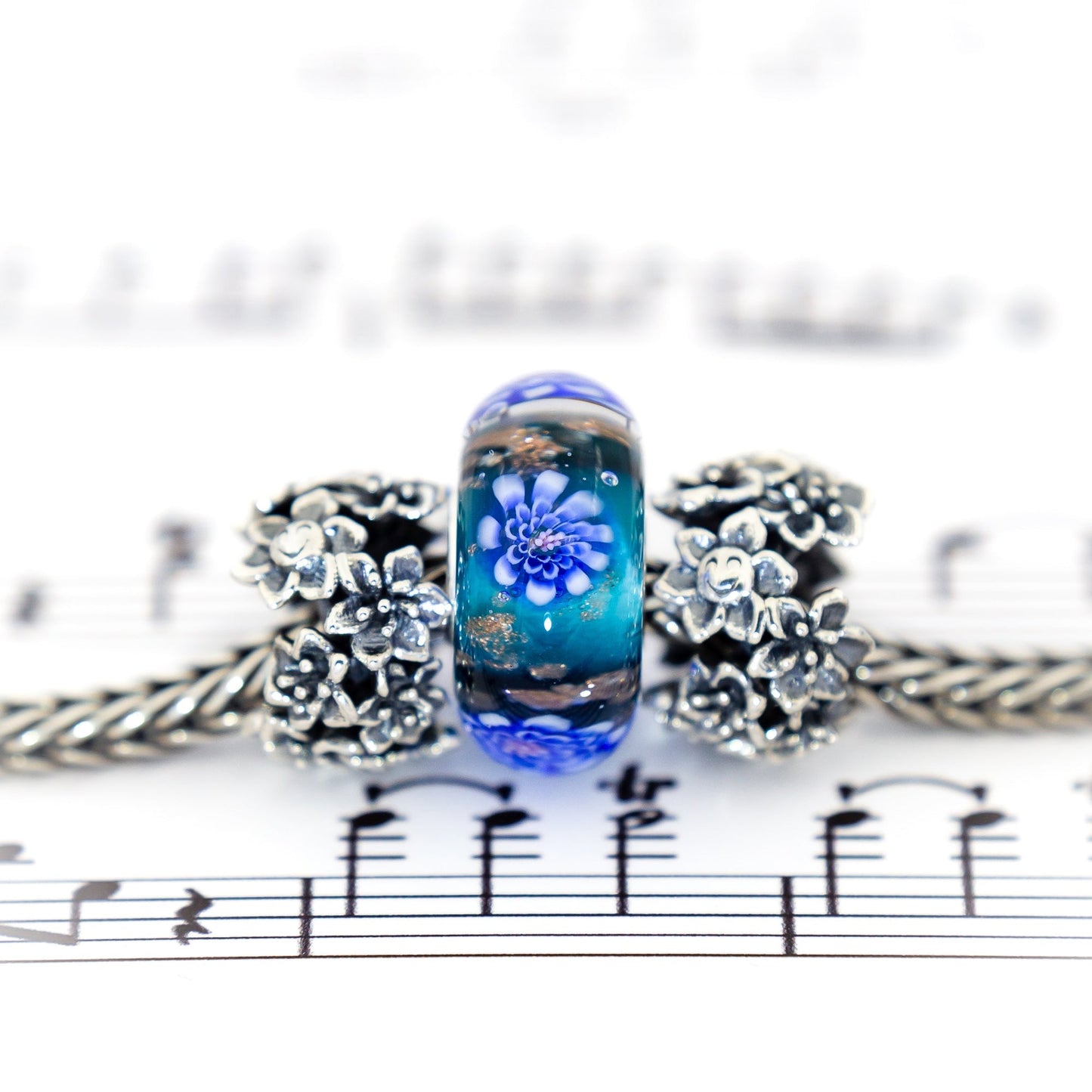 This bead is a fascinating dance of Ocean Flowers on a smooth surface of deep ocean waters in the moonlight. All our glass beads are made with the highest quality glass, sourced from all over the world. All our beads have a silver core with a 5 mm hole that fits all European bead brands. Our cores are marked with E925. This logo stands for Elfbeads and sterling silver925. If you want to be sure if your bead is an original Elfbeads, you can check the logo in the core.