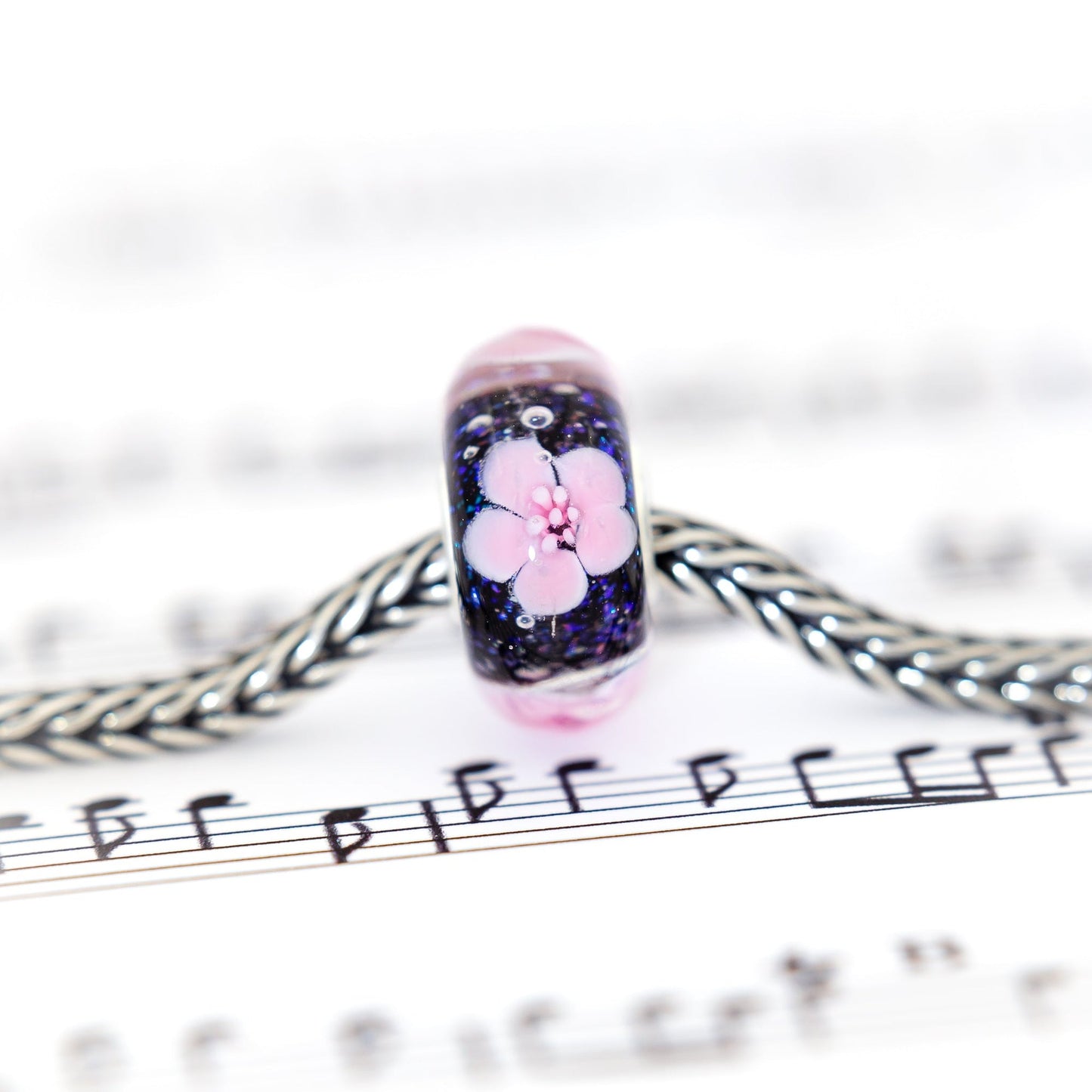 Delicate pink flowers are spreading their magic into the depth of the night sky. All our glass beads are made with the highest quality glass, sourced from all over the world. All our beads have a silver core with a 5 mm hole that fits all European bead brands. Our cores are marked with E925. This logo stands for Elfbeads and sterling silver925. If you want to be sure if your bead is an original Elfbeads, you can check the logo in the core.