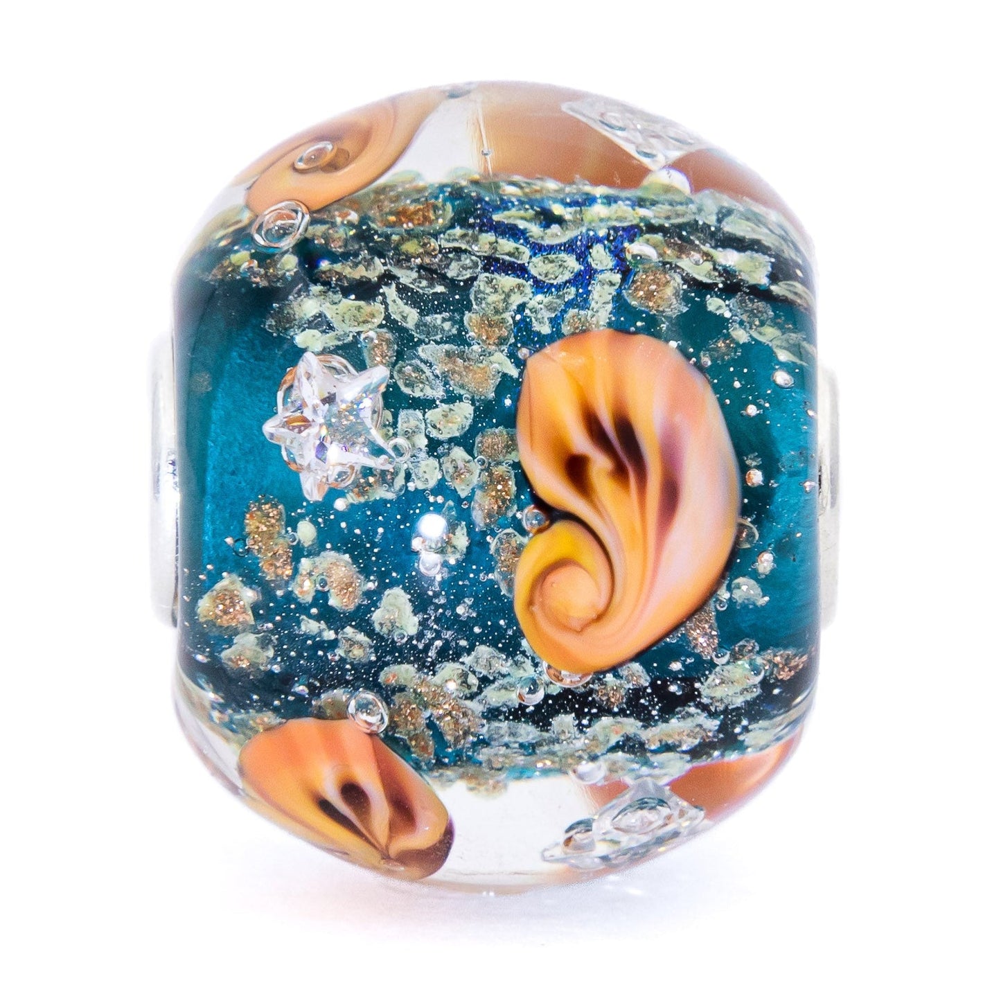 This bead takes you to the ocean beach, where you enjoy the shimmering sand and playful shells all year. Tiny stars are added for extra magic and a dream to come true. All our glass beads are made with the highest quality glass, sourced from all over the world. All our beads have a silver core with a 5 mm hole that fits all European bead brands. Our cores are marked with E925. This logo stands for Elfbeads and sterling silver925. If you want to be sure if your bead is an original Elfbeads, you can check the logo in the core.