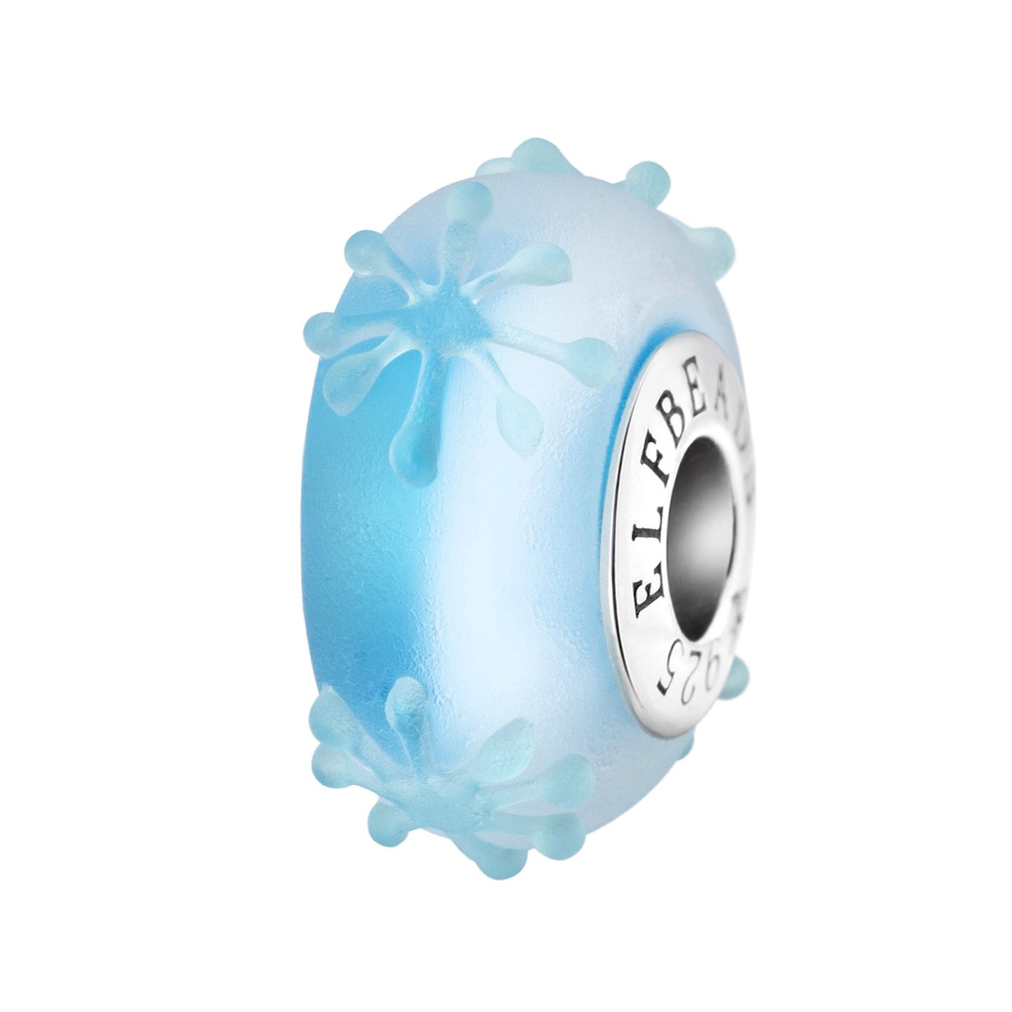 Snowflake Blizzard Frost is a mesmerizing bead that evokes the chilling beauty of a winter storm. It transports you to a Frozen kingdom, where icy winds swirl, and the snowflakes dance in a perfect blizzard. One half of the bead is kissed by the soft whiteness of freshly fallen snow, while the other shimmers in the coldest blue, capturing the essence of ice and winter's might. Coated in a frosty matte finish, it feels like the very touch of winter?s breath, delicate yet powerful. With every glance, you're reminded of the serene beauty and quiet strength of a snow-covered world, where magic and wonder freeze in the air.Our glass beads are crafted from the highest quality glass, sourced from all over the world. Each bead has a silver core with a 4.7mm hole, compatible with Elfbeads, Pandora, and Trollbeads bracelets. The core is marked with the E925 hallmark, representing Elfbeads and sterling silver 925.