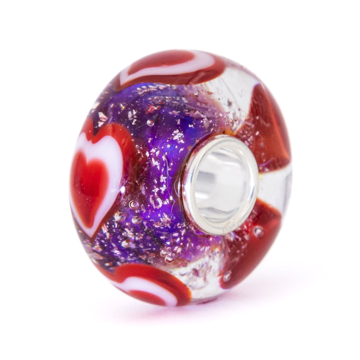 This is how true love would look if the hearts were floating in the space nebula. The delicate mixture of red, gold, and light purple makes the base of this bead spectacular! All our glass beads are made with the highest quality glass, sourced from all over the world. All our beads have a silver core with a 5 mm hole that fits all European bead brands. Our cores are marked with E925. This logo stands for Elfbeads and sterling silver925. If you want to be sure if your bead is an original Elfbeads, you can check the logo in the core.