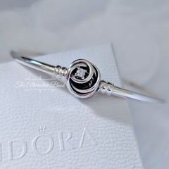 The sparkling hand-set zirconia crystal stone within the openwork encircled design of this exquisite Pandora Bangle shows the typical intricate craftsmanshipand care used for each product they create. The sleek and smooth bangle design can be adorned with bracelet charms enabling you or the wearer to express a certain style. The use of a soft linear design makes these Sparkling Silver Banglesfrom Pandoraideal for any occasion as they can be styled alongside different collections from the fantastic range of dangly charms, beads and pendants.