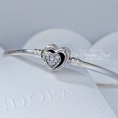 Inspired by the love between a mother and child, the Pandora Moments Entwined Infinite Hearts Clasp Bangle features eight clear cubic zirconia on a sterling silver heart that’s encased by the outline of another heart. The engraving reads: "Forever and ever and ever and ever and ever and ever and ever." Wear the bangle on its own or style it with up to 18 charms, dangle charms or pendants to tell your story.